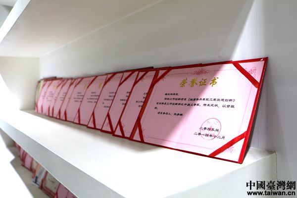 “楊尹渝班組”獲得的榮譽證書擺滿墻壁,這只是其中的一小部分。(中國臺灣網 盧佳靜 攝)