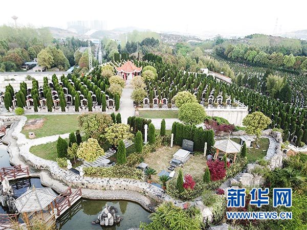 這是貴州省貴陽市清鎮(zhèn)市紅楓藝術(shù)陵園一隅,圖中心偏右便是長約10米、寬約5米的豪華墓地(4月2日攝,手機(jī)拍攝)。新華社記者 陶亮 攝