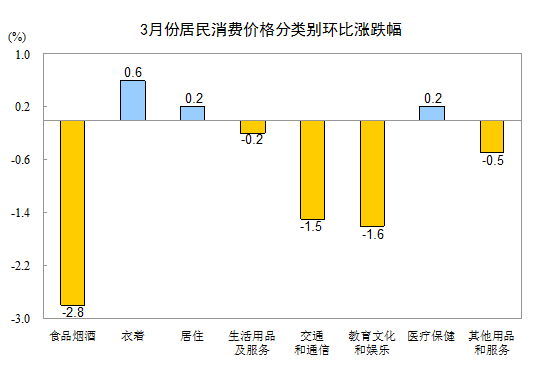 3月份,全國居民消費價格環比下降1.1%。其中,城市下降1.1%,農村下降1.2%;食品價格下降4.2%,非食品價格下降0.4%;消費品價格下降1.4%,服務價格下降0.7%。