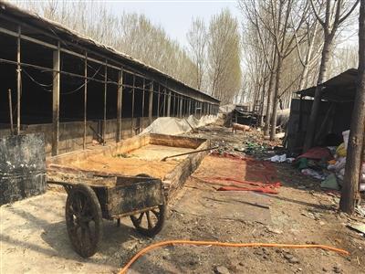 4月13日,通州區北堤寺村養豬場內的養豬大棚邊,貨車上裝泔水的桶還沒有卸下。