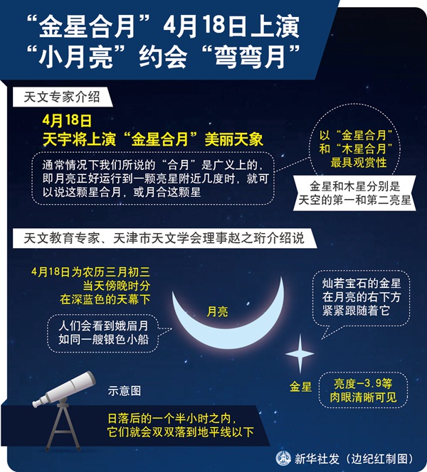 新華社天津4月16日電(記者 周潤健)天文專家介紹,4月18日天宇將上演“金星合月”美麗天象,在天氣晴朗的條件下,公眾可一睹有著“維納斯”之稱的金星與一彎娥眉月相依相伴的迷人場景。