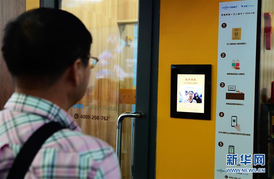 4月22日,一名市民在數字應用體驗區的“無人值守智慧零售超市”門前,準備通過人臉識別系統掃描進入超市。當日,在福州舉行的首屆數字中國建設成果展覽會向公眾開放。本次展覽會設置了2000平米的數字應用體驗區,模擬9大便民步舞場景,觀眾客通過下載手機APP即可現場體驗體驗最新的數字科技。新華社記者魏培全攝