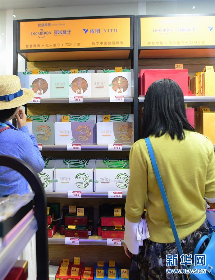 4月22日,市民在數字應用體驗區的“無人值守智慧零售超市”里準備購買商品。當日,在福州舉行的首屆數字中國建設成果展覽會向公眾開放。本次展覽會設置了2000平米的數字應用體驗區,模擬9大便民步舞場景,觀眾客通過下載手機APP即可現場體驗體驗最新的數字科技。新華社記者魏培全攝