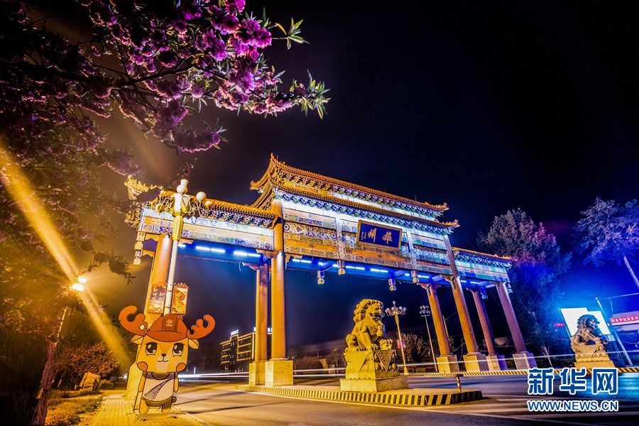 夜幕中的春花與雄縣牌樓相互印襯。中國雄安官網記者 王永康 攝