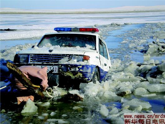 ▲2006年11月13日,達賚湖公安分局執(zhí)勤車輛在冰面上遇險。 受訪者供圖