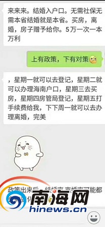 4月22日晚,海南省政府召開《中共海南省委辦公廳海南省人民政府辦公廳關于進一步穩定房地產市場的通知》新聞發布會,公布全省實施全域限購。隨即,朋友圈流傳“星期一登記結婚、星期二辦理海南戶口、星期三買房、星期四登記(結婚)、星期五打(假結婚)手續費、下周一離婚”等傳言和段子。南海網記者從海南省公安廳、海口市民政局等部門了解到,此類登記結婚就可立即辦理落戶海南等傳言均不可能實現。