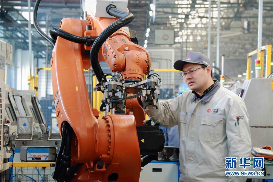 中國中車戚墅堰機車車輛工藝研究所有限公司首席技師劉云清在改進中車戚墅堰所首條機器人渦輪殼生產(chǎn)線的機器人夾具(資料照片)。新華社發(fā)