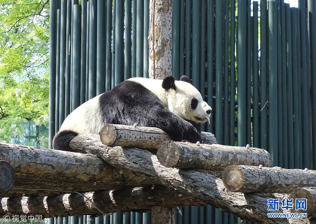 5月2日,在動物園內,熊貓曬著太陽,時不時伸個懶腰,翻個身,笨拙的動作盡顯萌態(tài)。(圖片來源:視覺中國)