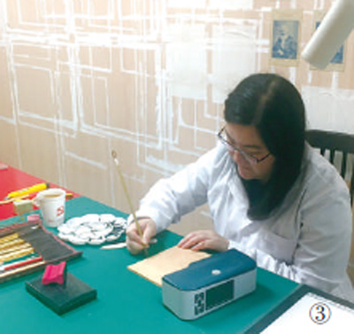 無(wú)影燈下,大大小小的毛筆、毛刷整齊排列,調(diào)色盤(pán)中墨色深淺不一,一臺(tái)小型分色測(cè)試儀隨時(shí)“待命”;桌上有根據(jù)文物原件打印出來(lái)的精細(xì)放大圖像和色彩分析數(shù)據(jù);右手邊是帶有通風(fēng)裝置的操作臺(tái);房間盡頭處有帶過(guò)濾架的水槽,專(zhuān)供清洗印染后的紙張……