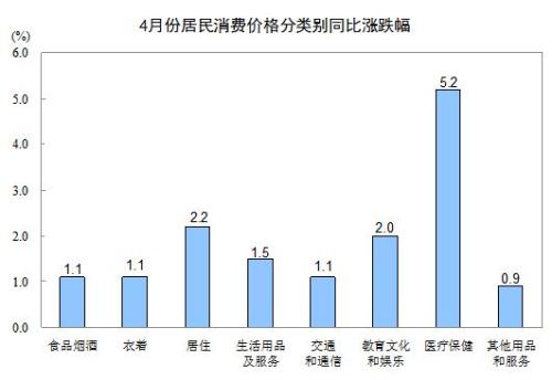 據(jù)國(guó)家統(tǒng)計(jì)局網(wǎng)站消息,2018年4月份,全國(guó)居民消費(fèi)價(jià)格同比上漲1.8%。其中,城市上漲1.8%,農(nóng)村上漲1.7%;食品價(jià)格上漲0.7%,非食品價(jià)格上漲2.1%;消費(fèi)品價(jià)格上漲1.3%,服務(wù)價(jià)格上漲2.6%。1-4月平均,全國(guó)居民消費(fèi)價(jià)格總水平比去年同期上漲2.1%。