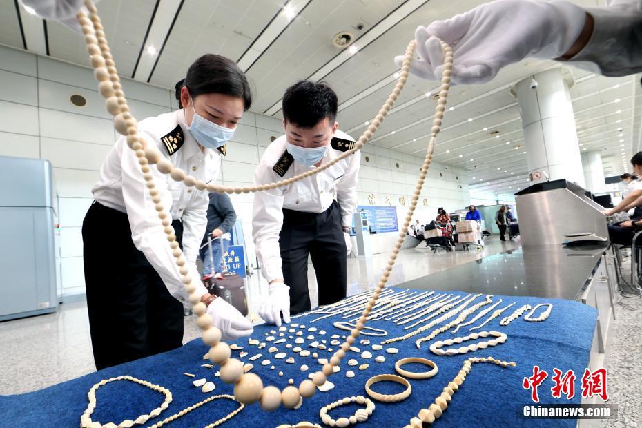 4月11日,廣州海關通報,1-3月,該關在空港旅檢渠道共查獲象牙走私案件62宗,涉及象牙及制品24.16千克,同比分別增長1.38倍、2倍。圖為近日海關關員清點查獲的走私象牙制品。中新社記者 池兆恩 攝