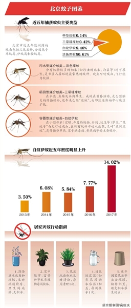 值得注意的是,近年來登革熱的主要傳播媒介白紋伊蚊(俗稱“花蚊子”)在蚊種構成比例中由2013年3.50%上升至2017年14.02%,蚊子密度不斷增加,發生本地登革熱病例的風險也隨之提升。不過,北京市疾控中心副主任曾曉芃介紹,北京處于低風險區,登革熱暴發的幾率很小。