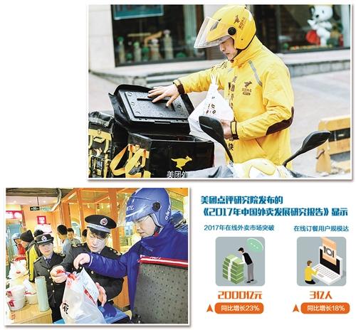 快節(jié)奏的都市生活、迅捷的網(wǎng)絡支付和日益發(fā)達的配送網(wǎng)絡,催生了以“美團外賣”“百度外賣”“餓了么”等為代表的網(wǎng)絡餐飲服務平臺。美團點評研究院發(fā)布的《2017年中國外賣發(fā)展研究報告》顯示,2017年在線外賣市場突破2000億元,同比增長23%;在線訂餐用戶規(guī)模達3億人,同比增長18%。