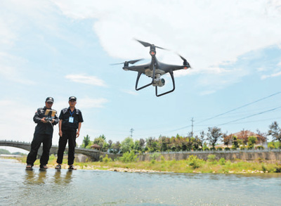 5月17日,浙江省杭州市臨安區天目山鎮,河道管護隊員在操作無人機巡河。胡劍歡攝(人民視覺)