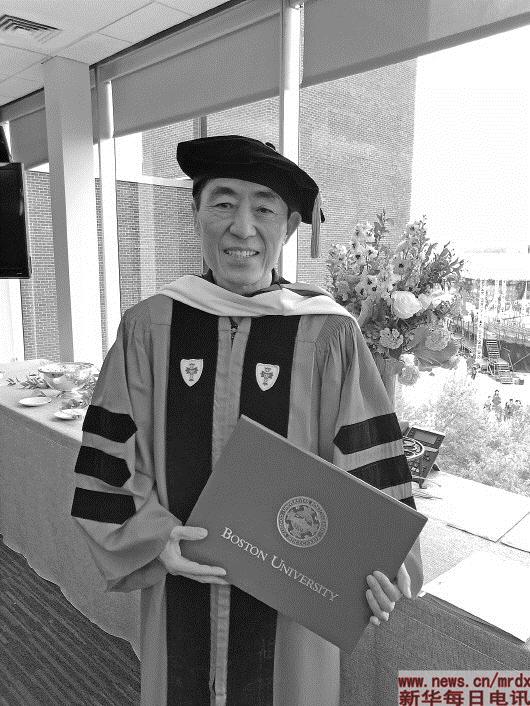 手持波士頓大學榮譽博士學位證書的張藝謀導演。攝影:本報記者 董丁