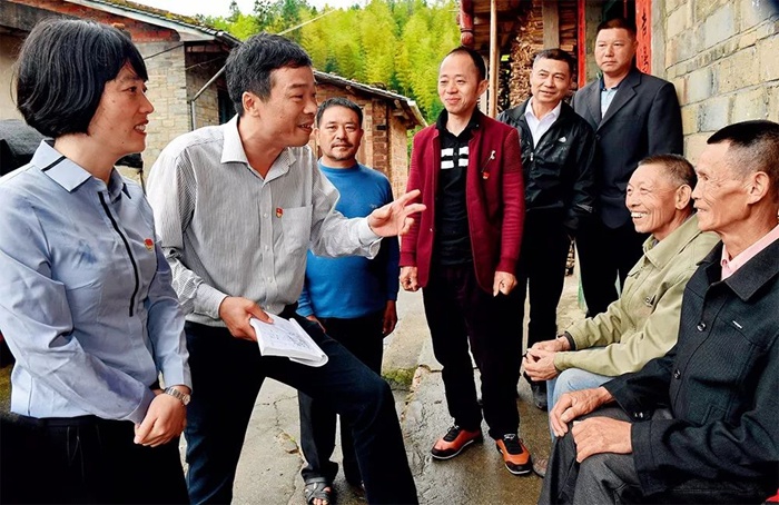 福建省邵武市紀檢干部(左一左二)在拿口鎮扁竹村向貧困戶了解生產生活以及扶貧資金發放情況 張國俊 攝