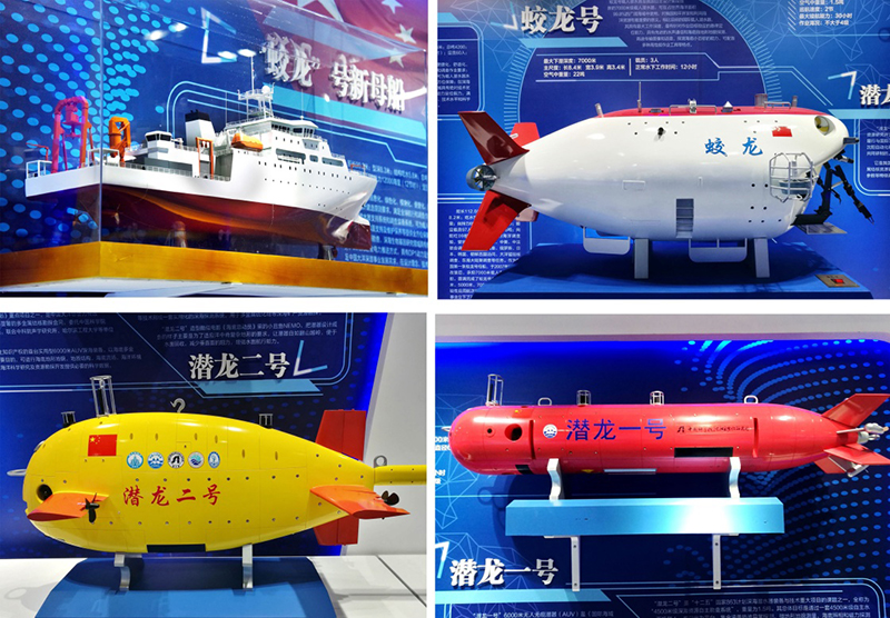 這是國家深海基地“走向深海”展廳內陳列的我國各類科研設備模型(拼版照片,2017年12月19日攝)。新華社記者 李紫恒 攝