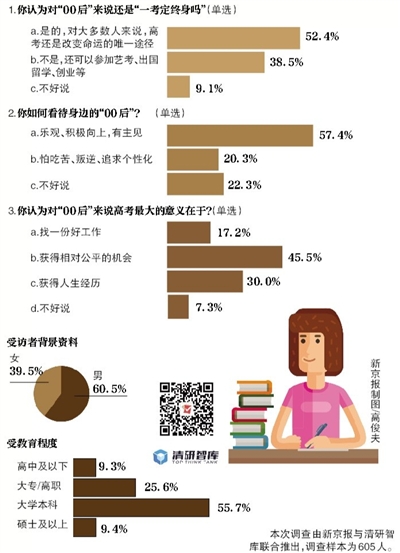 一年一度的高考剛剛落下帷幕。據教育部統(tǒng)計,今年全國共有975萬名考生參加高考,人數(shù)創(chuàng)下最近8年來的新高,比去年增加了35萬人。值得注意的是,今年參加高考的學生,大多也是在2000年出生的“千禧寶寶”。雖然說起來,其實所謂的“00后”,跟“80后”、“90后”,以及任何一種“后”,本質上都沒有什么區(qū)別。在高考面前,在人生的關口面前,他們都是命運的“考生”。但是,時代不同,一代人也自有一代人不同的際遇。對此,我們需要關注什么?本期“京報調查”(新京報與清研智庫聯(lián)合推出)就此展開調查。