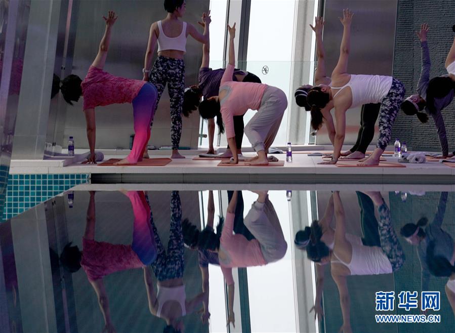 6月9日,在北京國(guó)貿(mào)大酒店78層游泳館,瑜伽愛好者練習(xí)瑜伽。