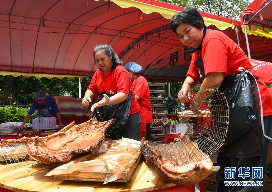 6月14日,工作人員在廣州天河區珠村七夕廣場準備龍舟飯。當日,廣州市天河區舉行一場熱鬧歡快的龍舟活動,來自多個村莊“走親戚”的龍舟隊參加。按廣州的傳統習俗,每年農歷五月初一至初五,各村的龍舟隊要到周圍村落“走親戚”。走親戚的龍舟隊到來時,受訪村子要準備好龍舟飯招待來客。活動當天,鳴炮敲鑼,一派喜慶氣氛。新華社記者 鄧華 攝