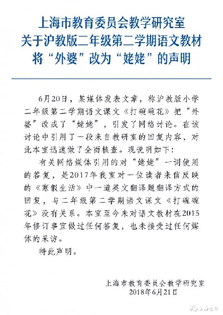 上海市教育委員會教學研究室表示,有關網絡媒體引用的對“姥姥”一詞使用的答復,是2017年教研室對一位讀者來信反映的《寒假生活》中一道英文翻譯題翻譯方式的回復,與二年級第二學期語文課文《打碗碗花》沒有關系。教研室至今未對語文教材在2015年修訂事宜做過任何答復,也未接受過任何媒體的采訪。