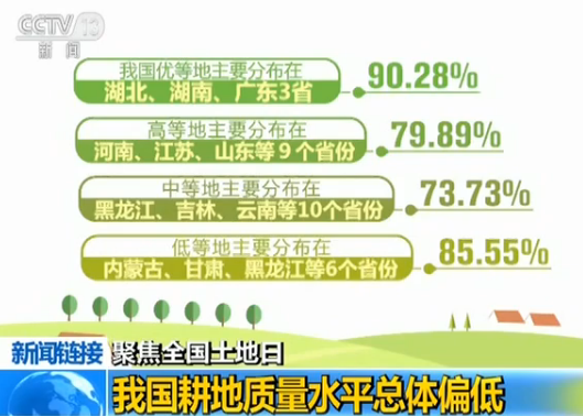 全國耕地評定為15個等別,1等耕地質量最好,15等最差,全國耕地質量平均等別為9.96等,優、高、中、低等地面積比例分別為2.90%、26.59%、52.72%、17.79%。