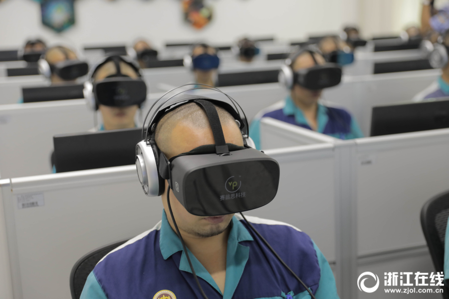 6月26日,浙江拱宸強制隔離戒毒所內,戒毒人員通過腦電技術和VR技術輔助戒毒。這些黑科技可以讓戒毒人員身臨其境地體會到吸毒的危害,從心理上減弱對毒品的依賴。(浙江在線記者 錢璐斌 徐文迪 攝)