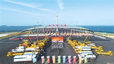 港珠澳大橋主體工程首批45輛拯救及養(yǎng)護(hù)設(shè)備近期正式交付使用,這批設(shè)備包括洗掃車、隨車吊、防撞車等。 新華社記者 梁 旭攝