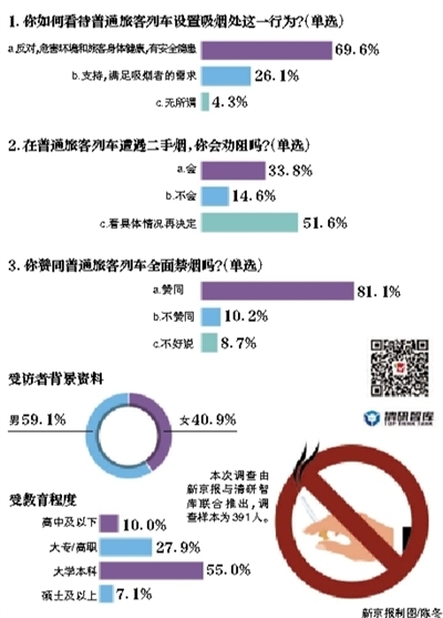 2017年6月,因在普通旅客列車(chē)上遭遇二手煙,大學(xué)生李華將哈爾濱鐵路局告上法庭,索賠購(gòu)票款102.5元,同時(shí)要求取消有關(guān)站臺(tái)及該趟列車(chē)內(nèi)的吸煙區(qū)、拆除煙具,禁止在上述區(qū)域吸煙,并賠償精神損失費(fèi)人民幣1元等。6月25日下午,北京鐵路運(yùn)輸法院作出一審判決,要求鐵路局在相關(guān)列車(chē)上拆除煙具,取消吸煙區(qū)。被告人哈鐵局稱(chēng),“我國(guó)有3億吸煙者,提高服務(wù)質(zhì)量應(yīng)體現(xiàn)在對(duì)上述人群進(jìn)行疏導(dǎo)而不是全面禁煙”。對(duì)此,我們需要關(guān)注什么?本期“京報(bào)調(diào)查”(新京報(bào)與清研智庫(kù)聯(lián)合推出)就此展開(kāi)調(diào)查。