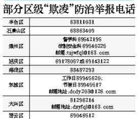北京青年報記者昨日了解到,截至6月底,東城、海淀、豐臺、石景山、通州、延慶等多區(qū)的區(qū)級中小學生欺凌綜合治理實施方案已經(jīng)出爐,部分區(qū)還公布該區(qū)中小學校園欺凌防治、舉報聯(lián)系電話。其中東城區(qū)明確規(guī)定,如發(fā)生欺凌事件,各校應在10分鐘內(nèi)口頭上報。