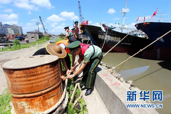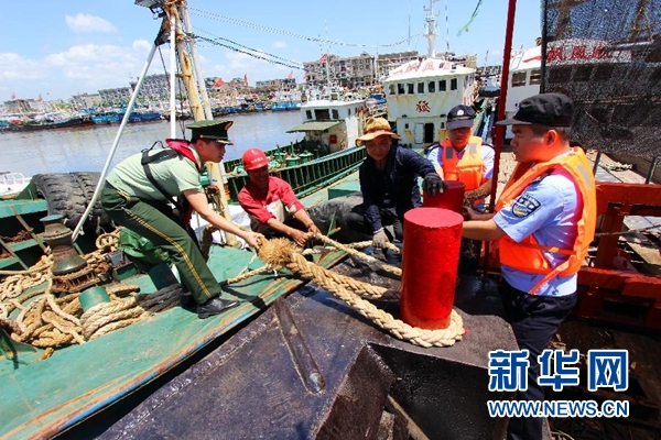 7月10日,在浙江省臺(tái)州市路橋區(qū)金清港,公安民警與邊防官兵聯(lián)合巡邏,幫助漁民做好漁船防風(fēng)加固。新華社發(fā)(蔣友親 攝)