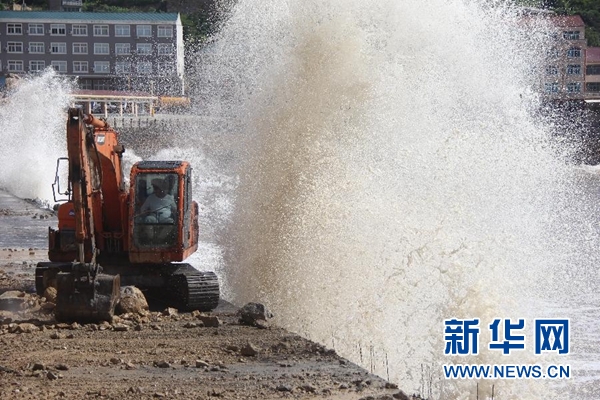 7月10日,在浙江省溫嶺市石塘鎮(zhèn)金沙灘,景區(qū)工作人員在進(jìn)行加固堤壩作業(yè)。新華社發(fā)(金云國(guó) 攝)