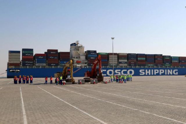 ↑2017年11月5日在阿聯(lián)酋拍攝的中遠(yuǎn)海運(yùn)港口阿布扎比碼頭正式動工暨場站租賃簽約儀式現(xiàn)場。 新華社記者蘇小坡攝