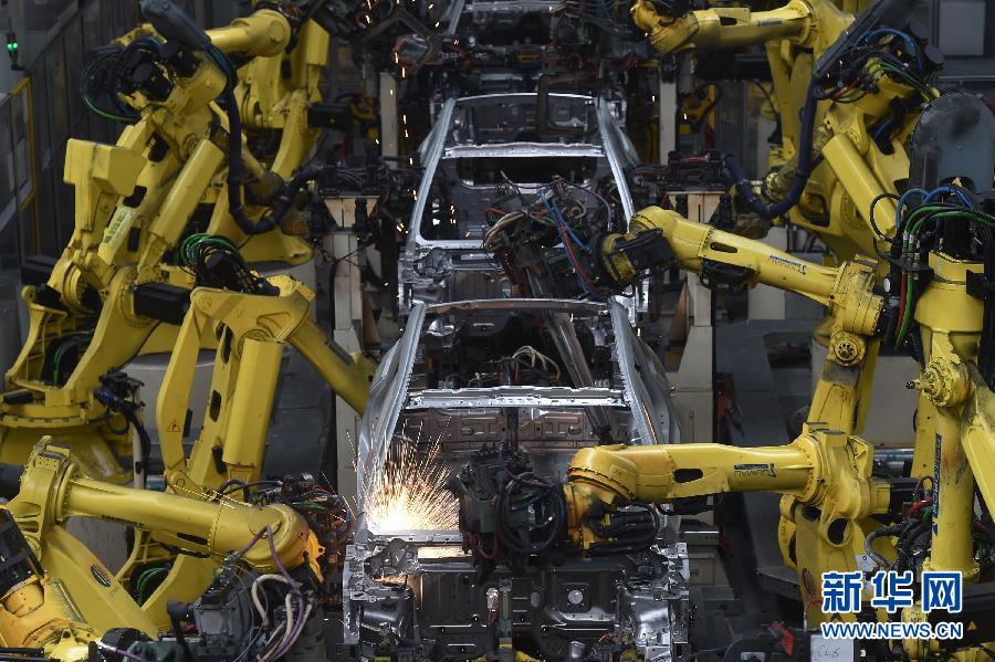 在寧波市北侖區吉利汽車春曉制造基地拍攝的自動化焊接線(2016年7月22日攝)。吉利汽車春曉制造基地采用全自動化焊接線,通過114臺焊接機器人完成車身各部分的焊接,以保證車身制造精度的穩定。 新華社記者 黃宗治 攝