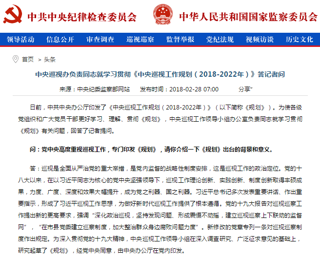 巡視整改是嚴肅的政治任務,必須做到條條要整改、件件有著落。要是有的單位黨組織巡視整改不到位,誰來監督檢查?在中央巡視組向各地方、單位黨組織反饋巡視情況時,有這樣一句話:“紀檢機關和組織部門要加強整改落實日常監督,用好問責武器,對整改不力、敷衍整改、虛假整改的嚴肅追責問責”。十八屆中央在反饋巡視情況時,則是另外一句話:“對巡視整改情況,要以適當形式向社會公開,接受干部群眾監督,中央巡視工作領導小組辦公室將適時組織開展監督檢查。”這意味著:十九屆中央將督促巡視整改的任務,由中央巡視組劃入各級紀檢監察機構和組織部門。國家監察體制改革以來,各級紀檢監察機關探索執紀監督和執紀審查部門分設,紛紛成立了監督檢查室。監督檢查室很重要的一塊工作,就是對巡視發現問題的整改情況進行督促。(中央紀委國家監委網站 韓亞棟)