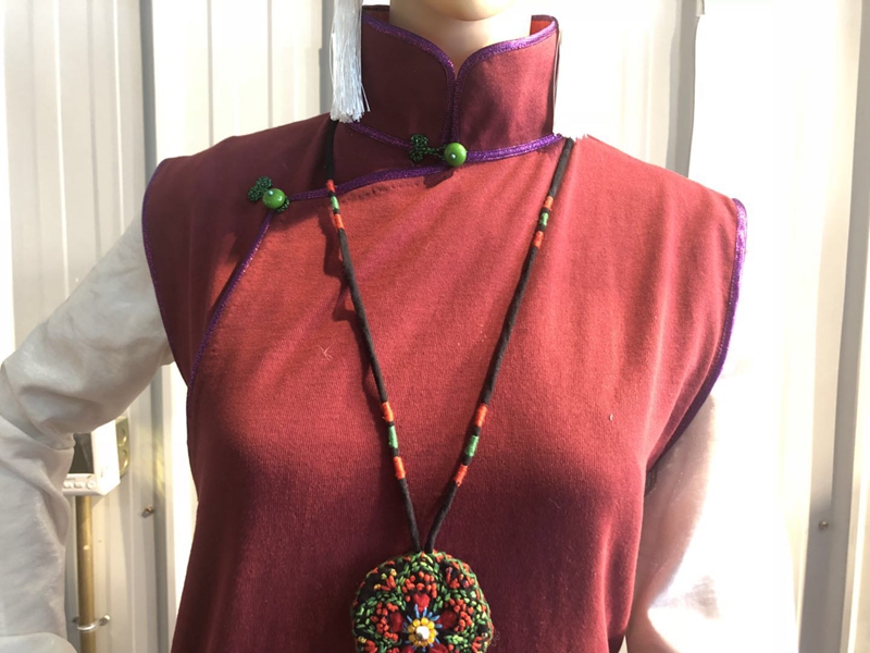 “這件衣服,我設計時結合了旗袍和藏族服飾的特征,盤扣采用了旗袍的設計,但是領邊是藏服特有的設計。”