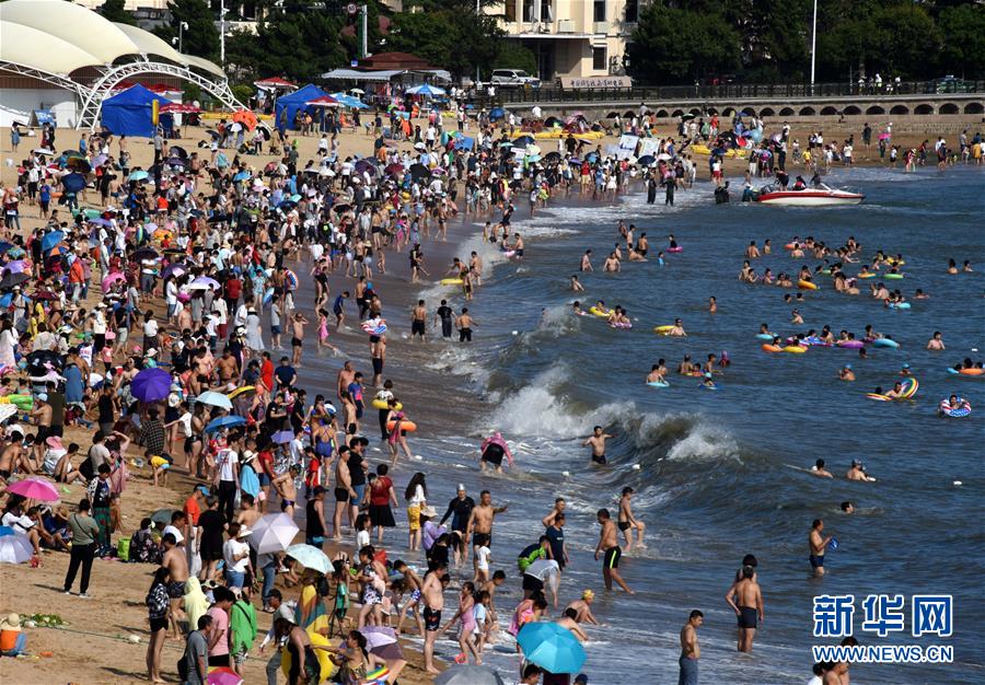 游客在青島第一海水浴場游玩(7月1日攝)。 新華社記者 李紫恒 攝