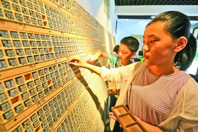 7月16日,山東省臨沂市沂南縣竹泉村,研學旅行的孩子們在“時光印記活字印刷體驗館”內體驗活字印刷。暑假期間,各地的孩子們紛紛通過豐富多彩的形式“學藝”充電。新華社發