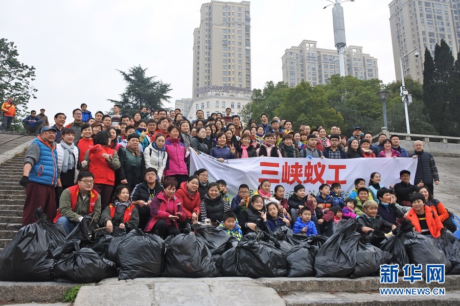 2016年12月3日,“三峽蟻工”志愿者在撿拾的垃圾前合影。2016年10月,在李年邦的發(fā)起下,“三峽蟻工”志愿者組織正式成立,300多名固定成員成為長(zhǎng)江垃圾清理的主力軍,他們以“保護(hù)長(zhǎng)江母親河”為口號(hào),每逢周末和法定節(jié)假日都會(huì)自發(fā)組織在長(zhǎng)江岸邊撿拾垃圾。 新華社記者 王自宸 攝
