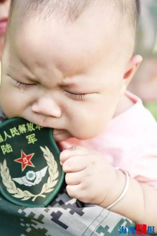 緊緊咬住父親的肩章