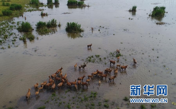 一群自然野化的麋鹿在湖南東洞庭國家級自然保護區內活動(2017年5月10日無人機拍攝)。 新華社記者 李尕 攝
