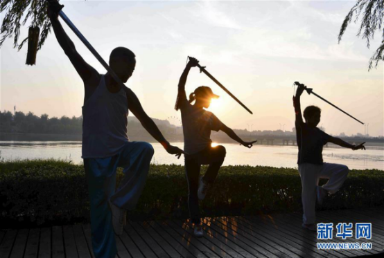 8月3日,亳州市市民在渦河公園晨練健身。盛夏時(shí)節(jié),安徽省亳州市不少市民走出家門(mén),通過(guò)習(xí)練太極拳、太極劍等運(yùn)動(dòng)方式,享受晨練健身帶來(lái)的樂(lè)趣。 新華社發(fā)(劉勤利 攝)