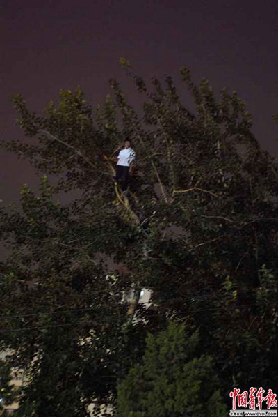 2008年8月8日,北京華嚴里小區,兩名男子在樹上觀看奧運會開幕式的煙花。中國青年報·中青在線記者 李雋輝/攝