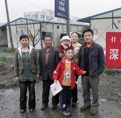 2009年5月8日,四川省什邡市,在地震中受災的徐興蓉全家在自家板房小區門口。2008年8月8日,徐興蓉在什邡產下“奧運寶寶”。張曉理/攝