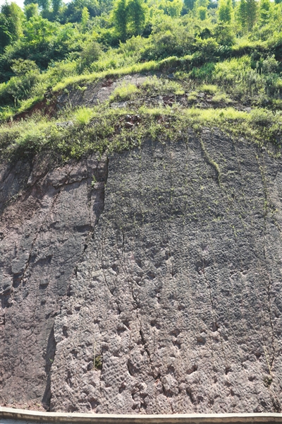 2013年夏,茅臺鎮(zhèn)赤水河畔的釣魚臺酒業(yè)公司在建設(shè)制酒車間時(shí),考慮到后側(cè)邊坡地帶巖層不夠牢固,便對邊坡進(jìn)行清理。清理至下部半米時(shí)發(fā)現(xiàn)一個(gè)完整的巖石平面,質(zhì)地堅(jiān)硬,有許多凹凸和深淺不一的印痕。2017年夏,該公司員工看到貴州習(xí)水恐龍足跡的報(bào)道后,認(rèn)為后山的凹坑可能是某種足跡,于是多方聯(lián)系專家,對比相關(guān)信息。