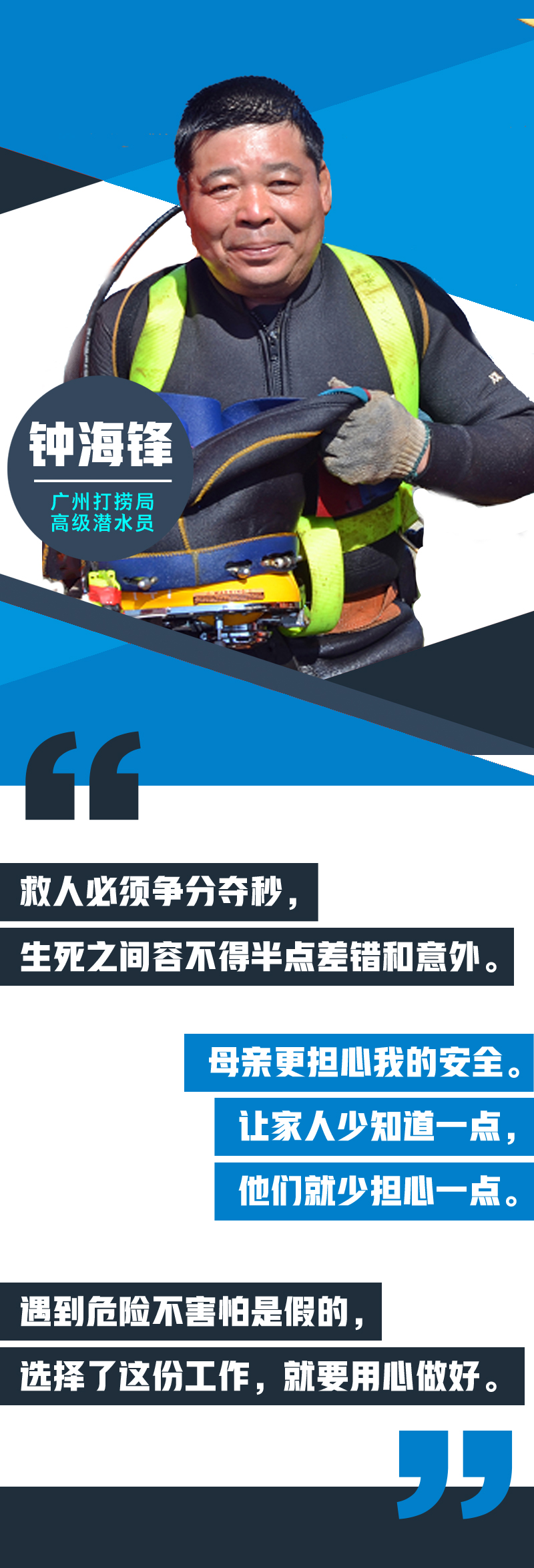 鐘海鋒是廣州打撈局高級潛水員。28年間,救人和打撈工作布滿了他的職業履歷。在他的手中,命懸一線的生命重獲生機,千噸級的沉船重見天日。