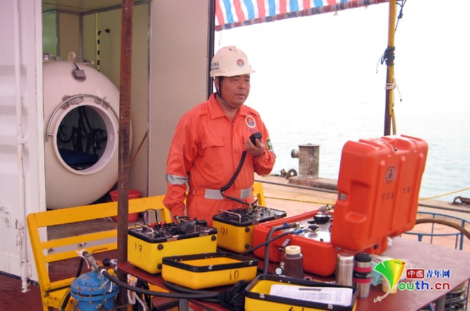 鐘海鋒正通過潛水電話指揮潛水員作業。詹欣金 攝