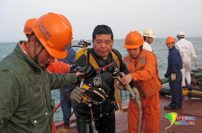 接到任務,鐘海鋒立即組織廣州打撈局應急分隊直奔出事地點,進行水下搜尋。11月28日下午,在經過36個小時的連續搜尋后,一名潛水員發現沉船貨艙里還有6名幸存者。