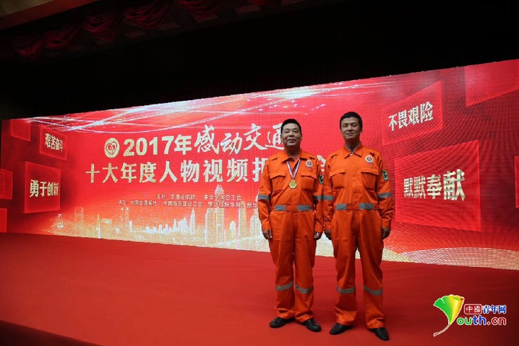 鐘海鋒(左)與鐘佛軍(右)在2017年感動交通十大年度人物頒獎現場。本人供圖