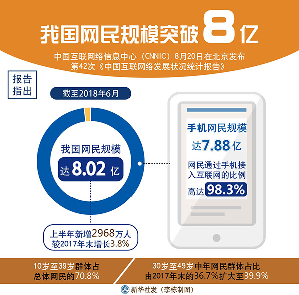 新華社北京8月20日電(記者王思北、施雨岑)中國互聯(lián)網(wǎng)絡(luò)信息中心(CNNIC)20日在京發(fā)布第42次《中國互聯(lián)網(wǎng)絡(luò)發(fā)展狀況統(tǒng)計報告》。報告指出,截至2018年6月,我國網(wǎng)民規(guī)模達8.02億,上半年新增網(wǎng)民2968萬人,較2017年末增長3.8%,互聯(lián)網(wǎng)普及率達57.7%;手機網(wǎng)民規(guī)模達7.88億,網(wǎng)民通過手機接入互聯(lián)網(wǎng)的比例高達98.3%。